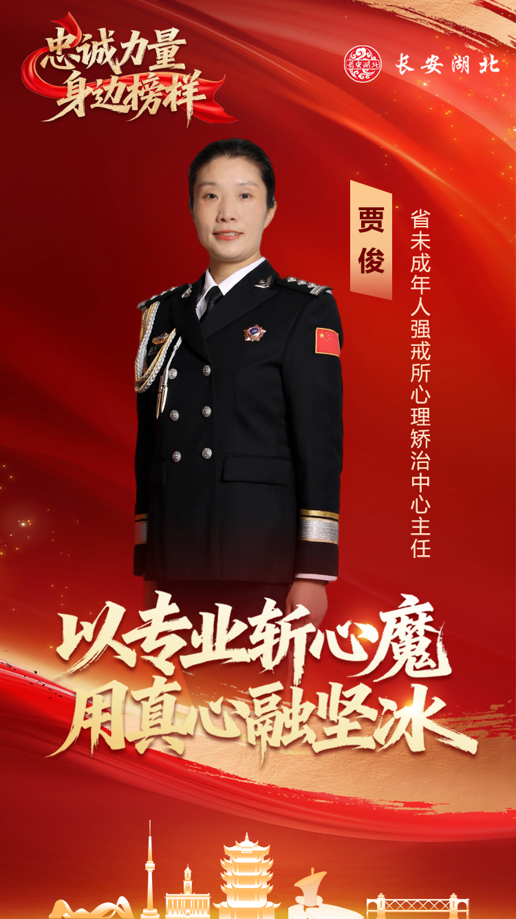 贾军女士(女,1976年1月出生)心理矫正中心主任湖北省强制隔离未成年人戒毒康复中心二级警长,国家司法行政戒毒系统心理矫正专家,司法部国家司法行政戒毒系统公共关系人才库成员。她先后被评为司法部最美法律服务人员、最美戒毒警官、湖北省“3月8日红旗手”标兵、湖北省“巾帼建功”标兵、湖北省“百强”专家等。被评为本月精竹模范人物,并荣获湖北省司法行政系统心理技能大赛第一名。